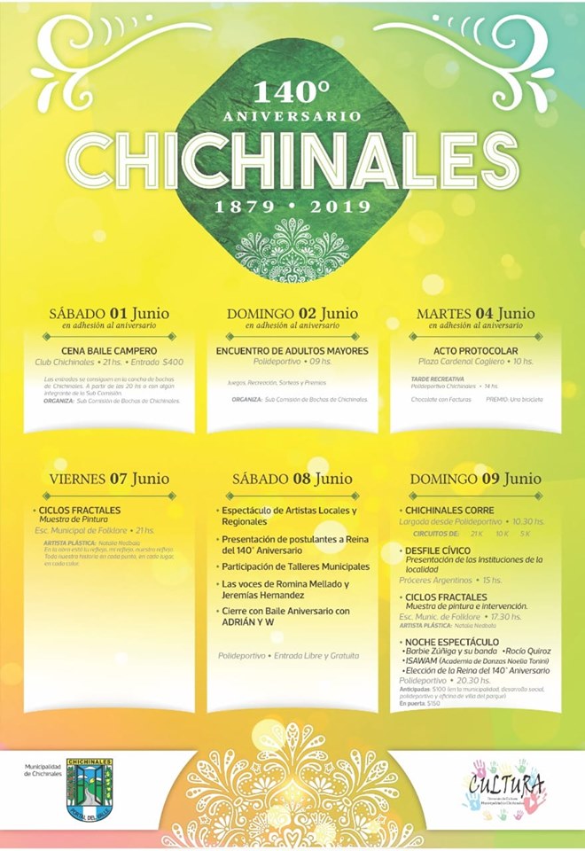 El pasado sábado 1° comenzó el cronograma, con cena y baile campero y un encuentro de adultos mayores, el domingo 2. Continuarán con una muestra de pintura el viernes 7, para cerrar con un fin de semana con espectáculos, la elección de la Reina, la carrera “Chichinales corre” y el desfile cívico militar.